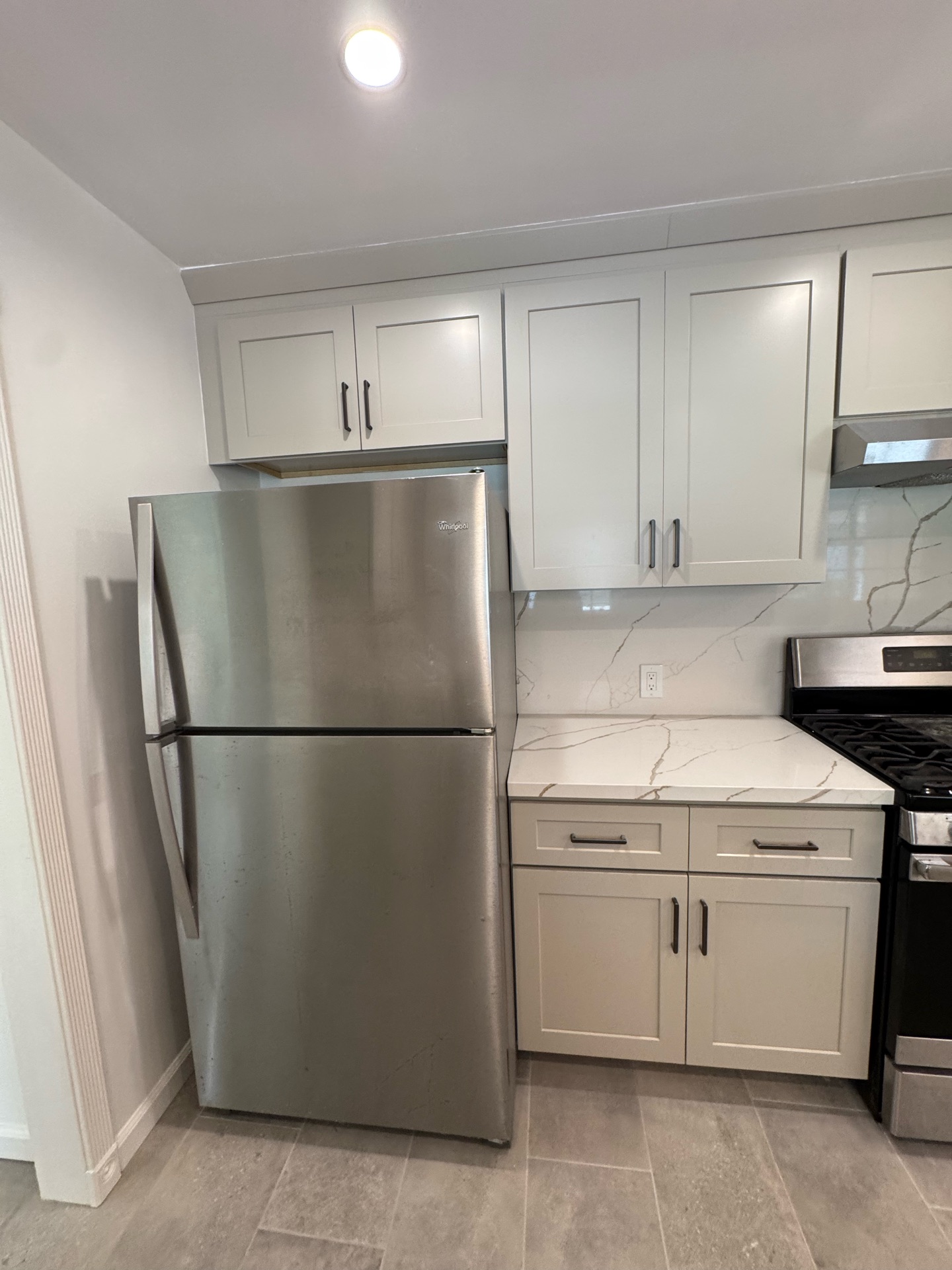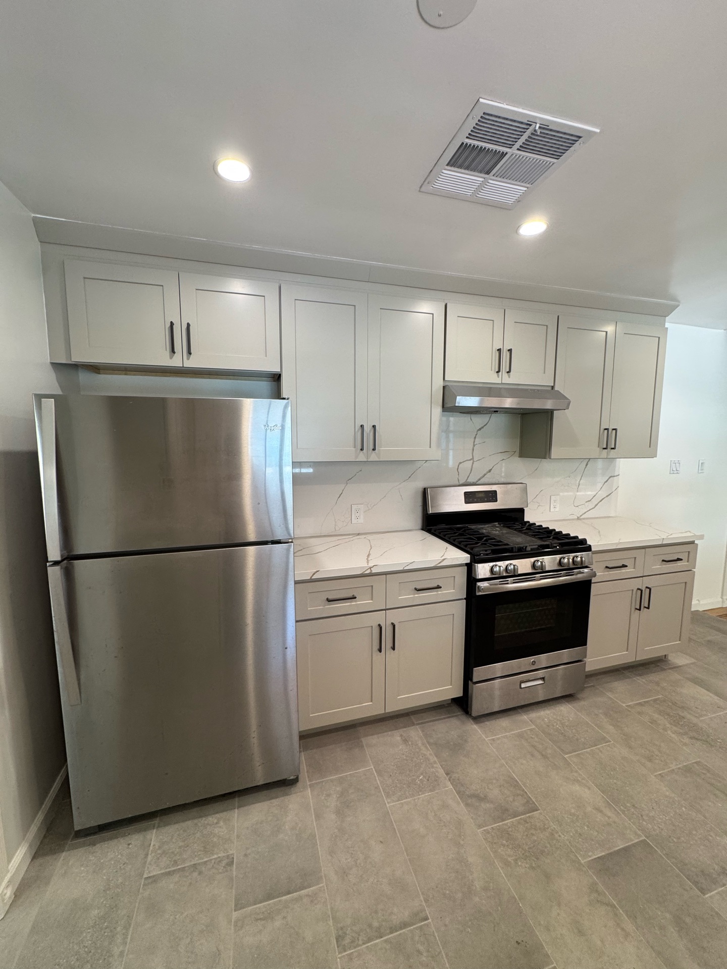 A brand-new stainless steel refrigerator, gas range, and hood were installed. These not only elevate the modern look but also bring high performance and efficiency to daily cooking needs. - Flooring