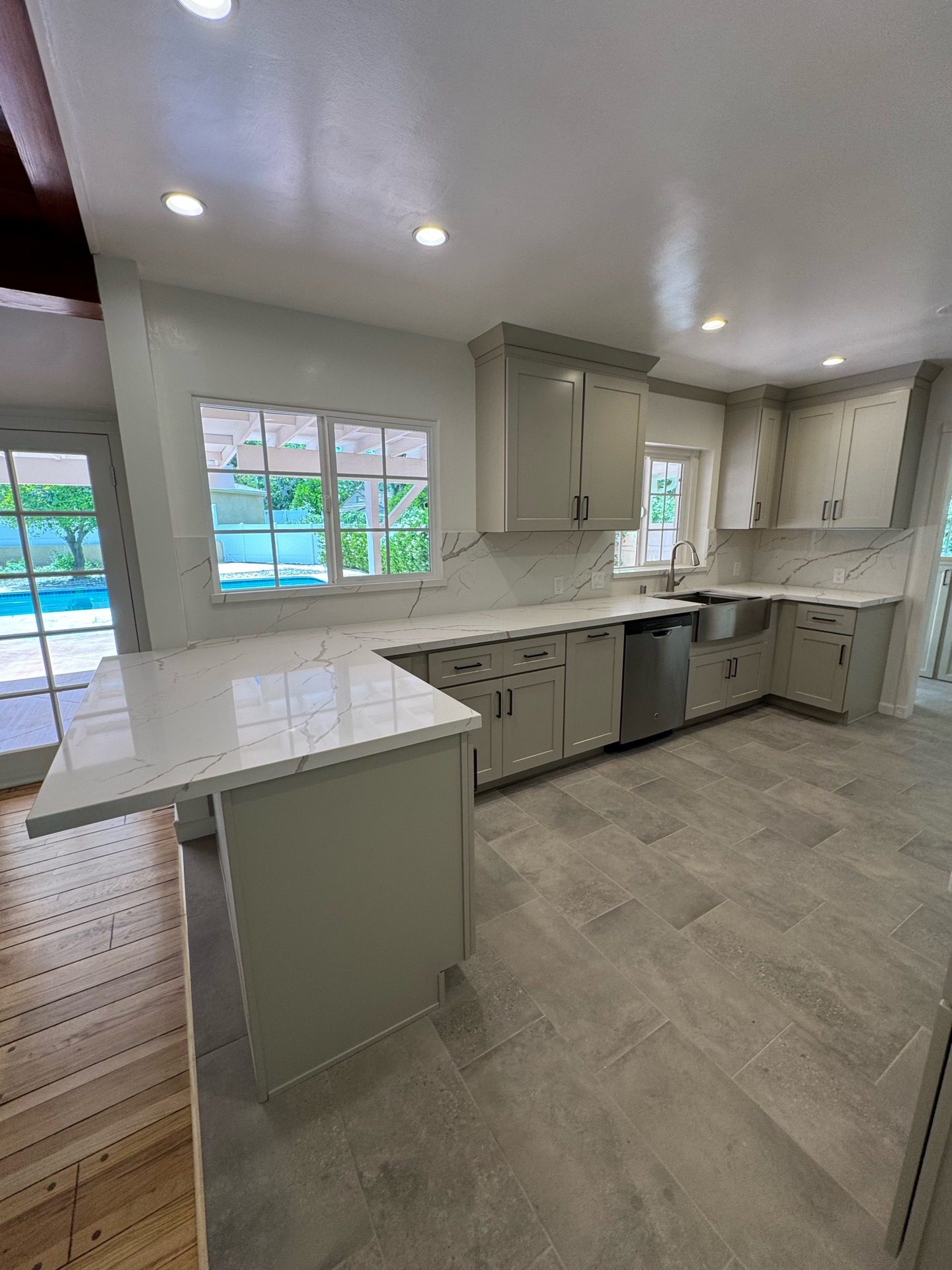 - Design & Planning: Next, we develop a detailed design plan. From selecting cabinets and countertops to choosing flooring and fixtures, we guide you every step of the way.