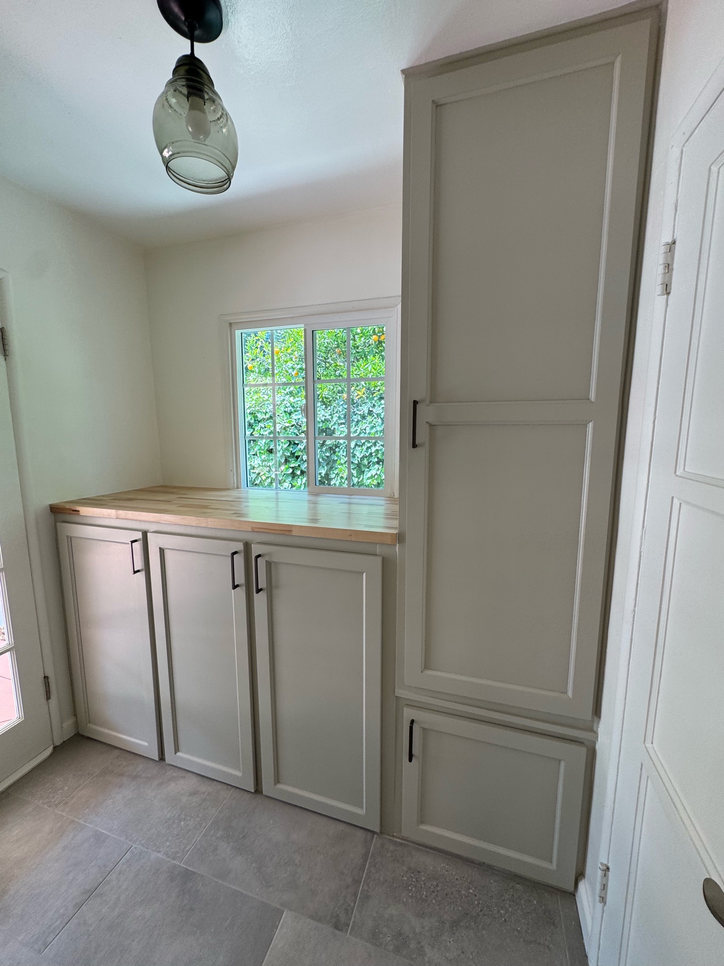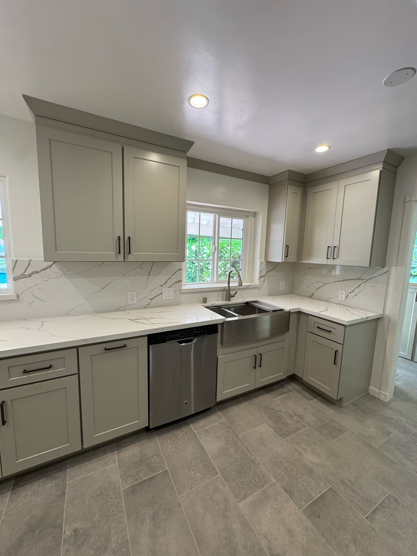 The kitchen now features contemporary shaker-style cabinets in a soft gray tone. These cabinets provide a sleek look while offering plenty of storage space. The simple design blends seamlessly with the modern theme. - Countertops & Backsplash